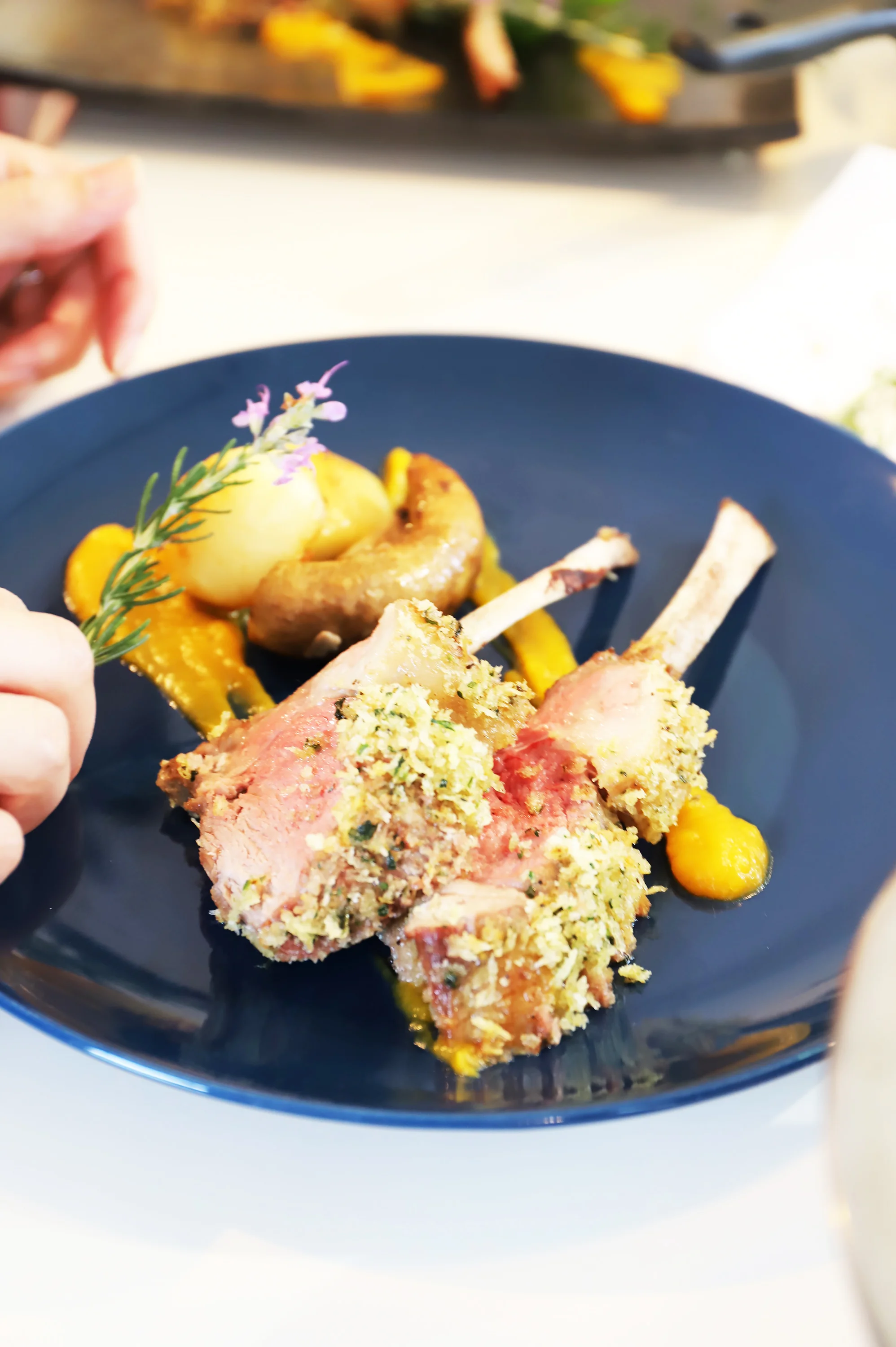 『 herb crusted lamb racks with butternutsquash puree,roast potatoes, garlic mushrooms and butter sauteed kidney beans 』